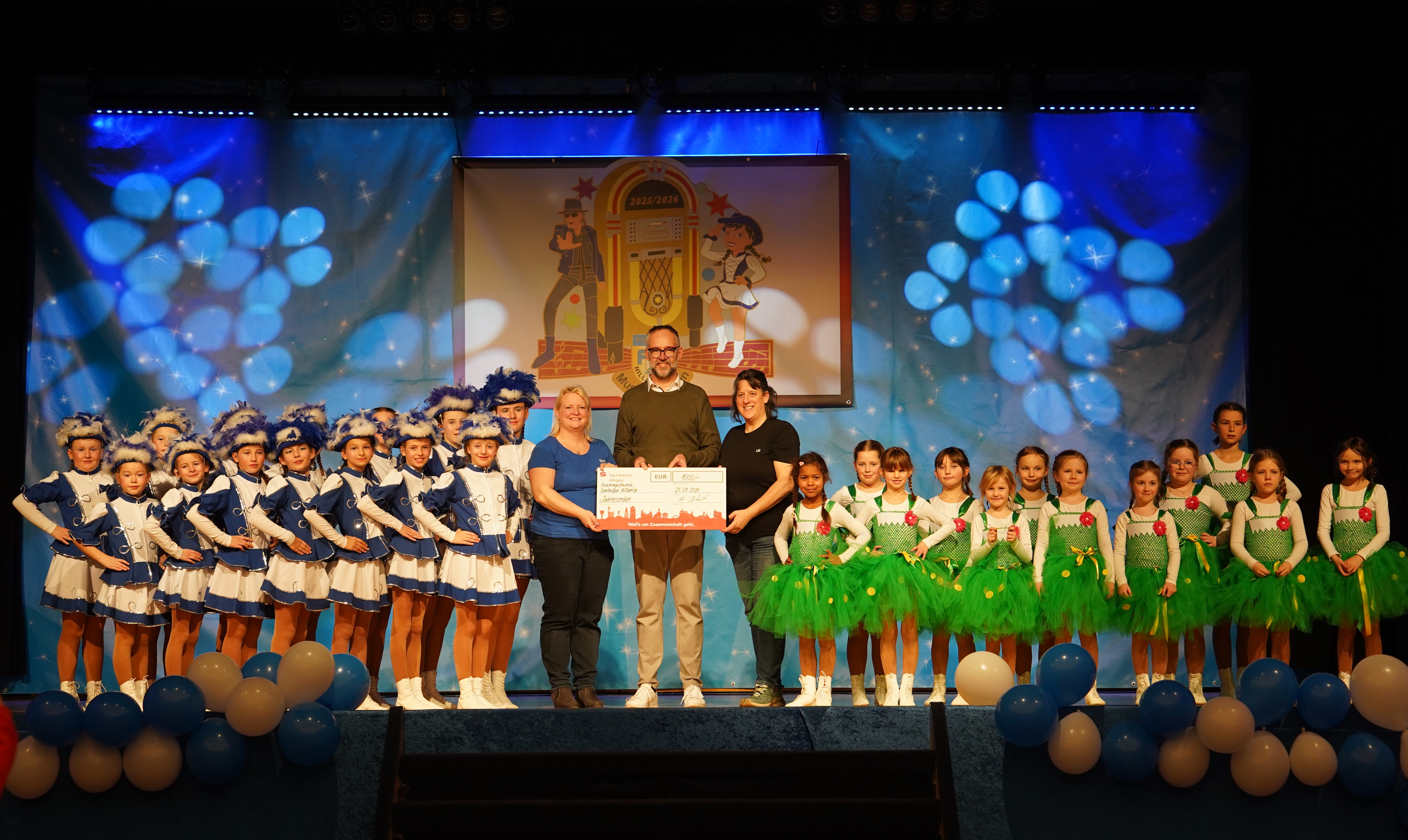 , Julia HaldSonthofen, 23.01.2026 – Pünktlich zum Faschingsauftakt 2026 durfte Christian Böck, Marktbereichsleiter Sonthofen der Sparkasse Allgäu, den Faschingsfreunden Sonthofen Hillaria e.V. eine Spende in Höhe von 1000 Euro überreichen. Hierzu besuchte er die Generalprobe für den ersten Ball der Saison, bei der unter anderem die Jugendgarde im blauen Gardekleid und die Purzelgarde im Tabaluga-Showtanzkostüm für den großen Auftritt übten.