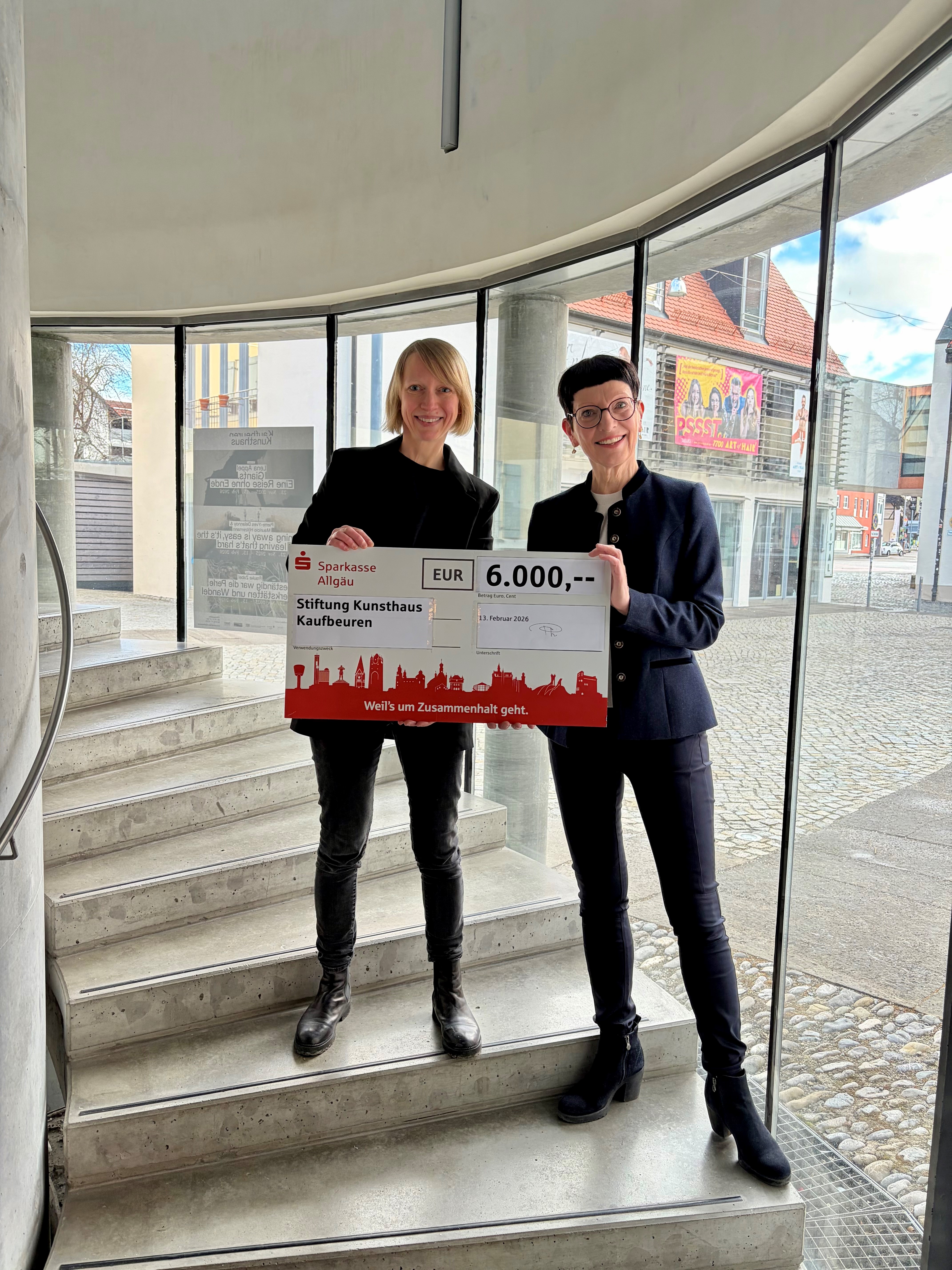 , Julia HaldKaufbeuren, Februar 2026 – Die Förderung von Kunst und Kultur hat bei der Sparkasse Allgäu seit vielen Jahren einen hohen Stellenwert. Deshalb unterstützte das Finanzinstitut im Rahmen einer langjährigen Partnerschaft erneut die wertvolle Ausstellungsarbeit der Stiftung Kunsthaus Kaufbeuren. Bei einem persönlichen Treffen mit Lisa Britzger, der künstlerischen Leiterin des Kaufbeurer Kunsthauses, überreichte Birgit Pfeifer, stellvertretendes Vorstandsmitglied der Sparkasse Allgäu, einen symbolischen Spendenscheck über 6.000 Euro. Das Geld ist in erster Linie für die Realisierung der Ausstellungen im Kunsthaus vorgesehen.