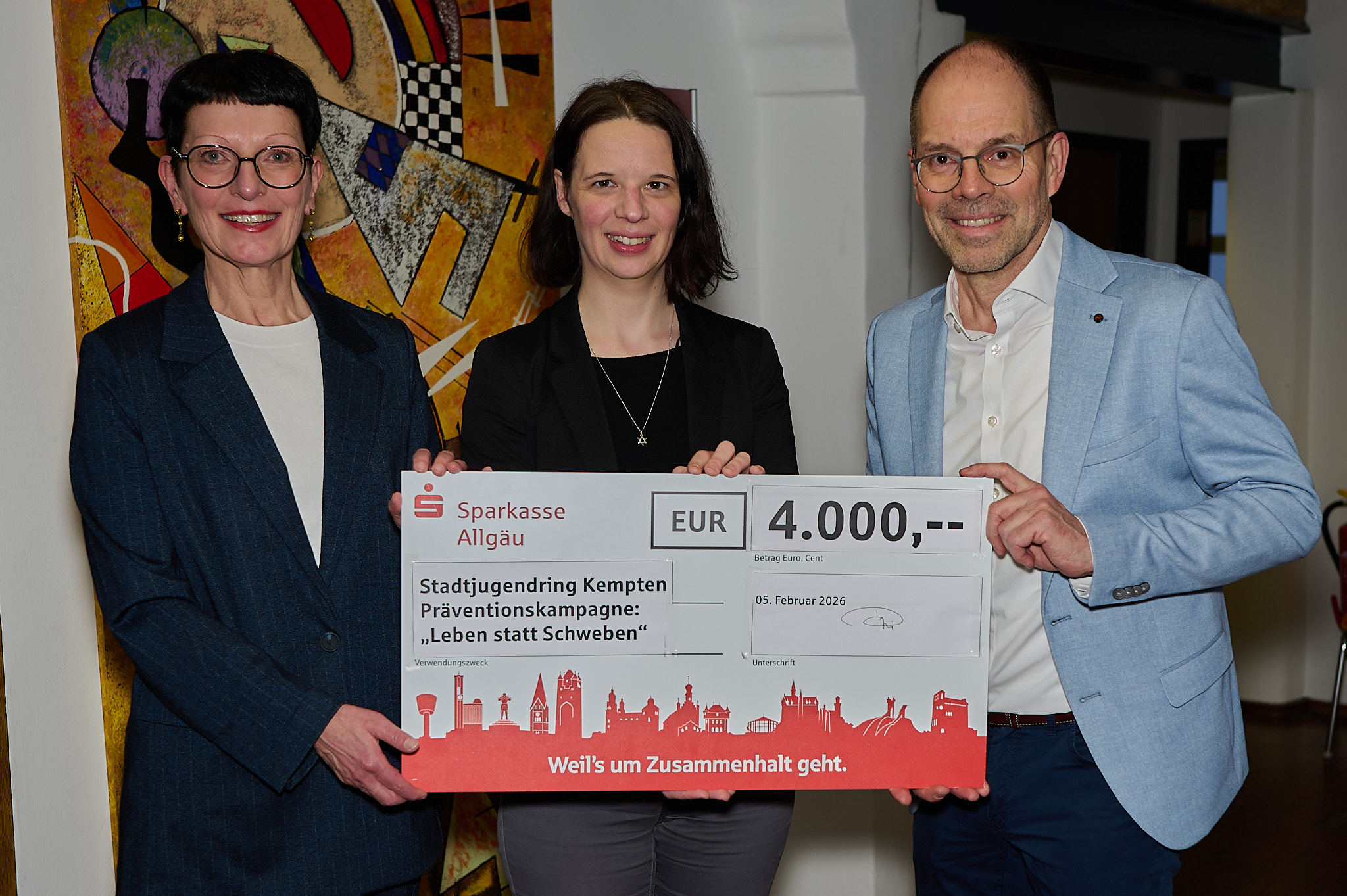 , Nina HammererKempten, 05. Februar 2026 – Die Sparkasse Allgäu unterstützt erneut die Suchtpräventionskampagne „Leben statt Schweben“ des Stadtjugendrings Kempten (SJR) mit einer Spende in Höhe von 4.000 Euro. Stellvertretend für die Sparkasse Allgäu übergaben Birgit Pfeifer und Andreas Hirschle die Spende an Vanessa Menke, stellvertretende Vorsitzende des SJR.