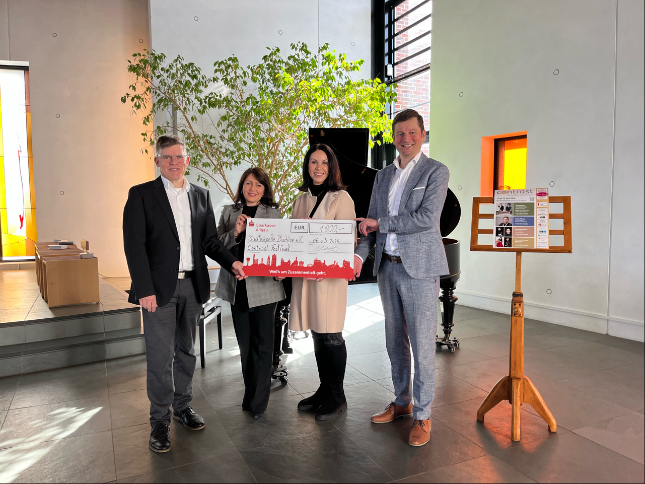 Um das große Engagement der Initiatoren zu unterstützen, überreichte Alexander Herz, Marktbereichsleiter Buchloe der Sparkasse Allgäu, den drei Verantwortlichen einen Spendenscheck über 1.000 Euro. „Die Förderung kultureller Projekte wie das Contrast Musikfestival ist für uns von großer Bedeutung. Sie tragen maßgeblich zur Lebensqualität in unserer Region bei und schaffen Begegnungsräume für Musikbegeisterte aller Generationen. Als Sparkasse sehen wir es als unsere Aufgabe, die kulturelle Vielfalt vor Ort nachhaltig zu sichern“, betont Alexander Herz.