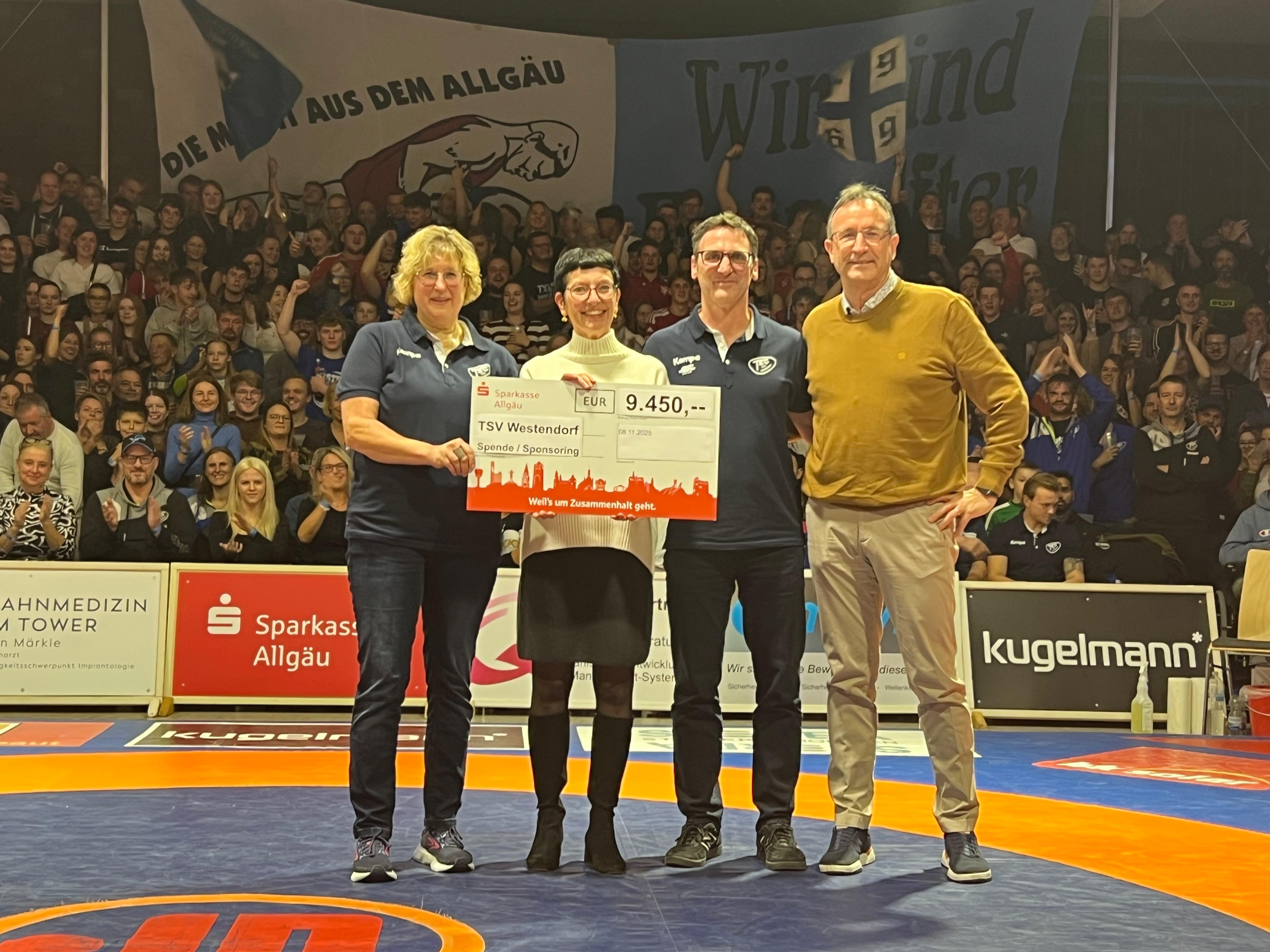 , Nina HammererWestendorf, 08. November 2025 – Im Rahmen des Heimkampfes gegen Oberölsbach übergab die Sparkasse Allgäu eine Spende in Höhe von 3.500€ an den TSV Westendorf. Die Spende kommt der Jugendarbeit des Vereins zugute. Zusammen mit dem Sponsoring unterstützt die Sparkasse Allgäu den TSV Westendorf in diesem Jahr mit insgesamt 9.450€.