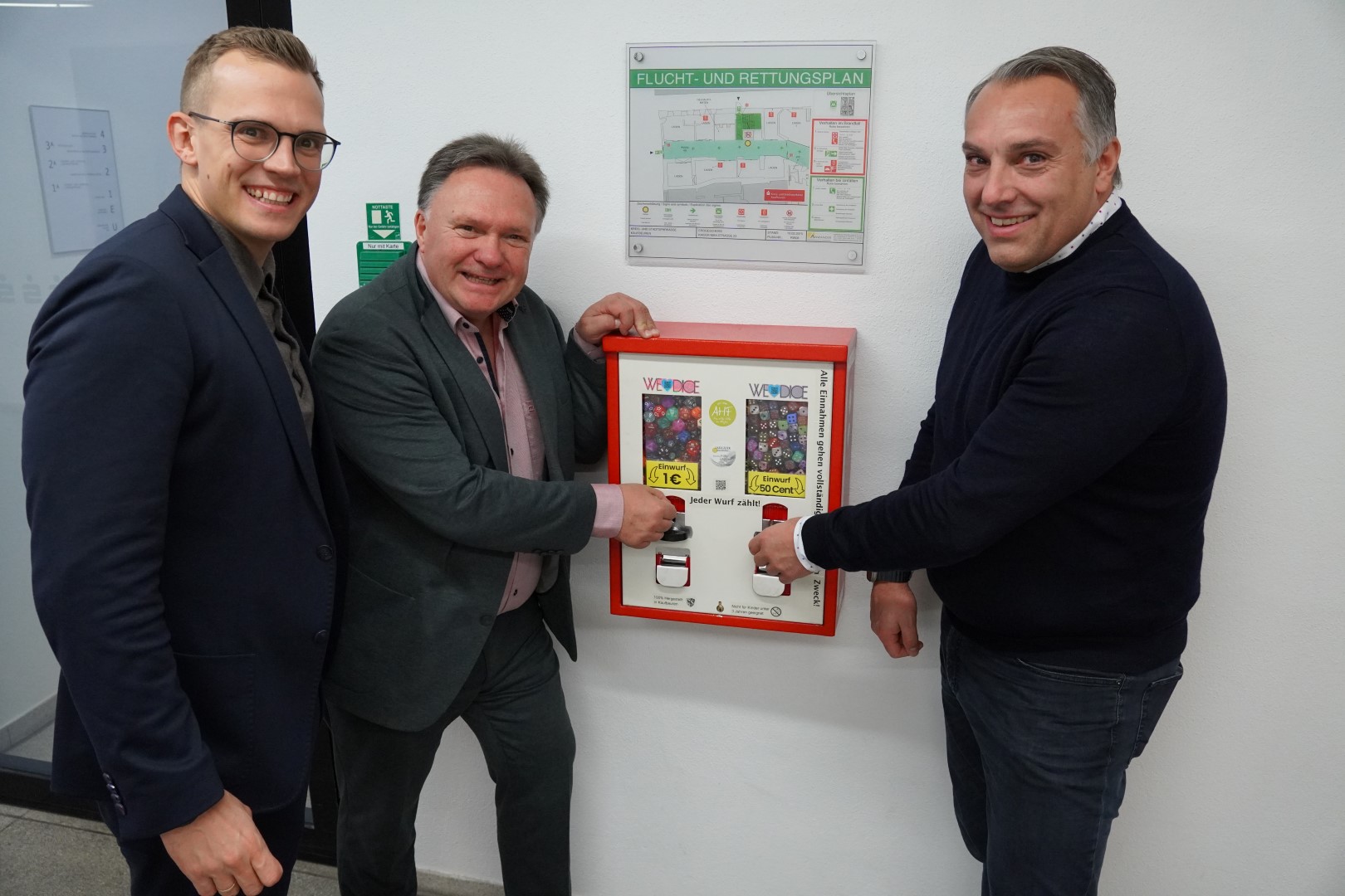 Statt Süßigkeiten gibt es hier kleine Würfel – der gesamte Erlös aus dem Verkauf geht an den Allgäuer Hilfsfonds e.V. (AHF). Die Idee zu diesem besonderen Spendenprojekt stammt von Thomas Weissbarth, Geschäftsführer der Firma Bartel-Weissbarth, der die Automaten kostenfrei zur Verfügung stellt und die Einnahmen regelmäßig an den Hilfsfonds spendet.